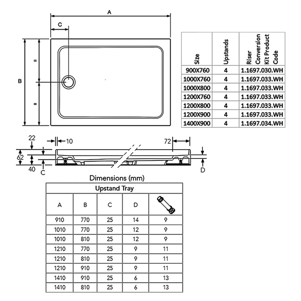 Riser kit allows you to convert a Mira Flight tray to a riser tray providing the flexibility of installation on a solid floor. Each kit contains easy to install removable panels, simple clip-on fixings and robust adjustable push-fit riser legs.