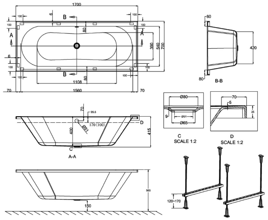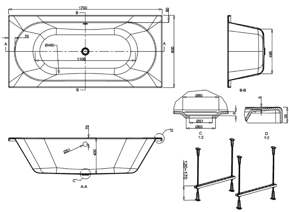 Bath Tub L - 1700mm x W - 800mm x H - 415mm R43CW