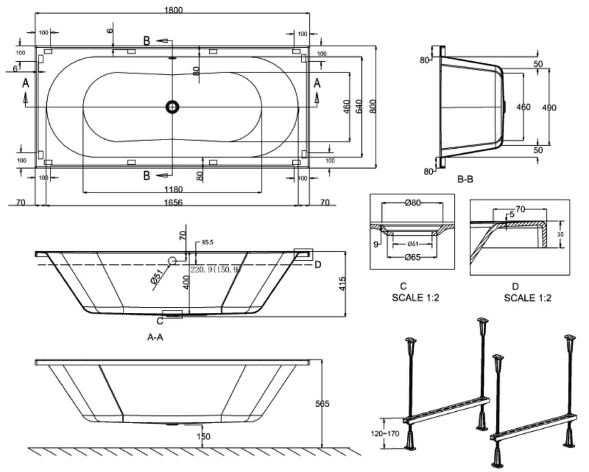 Bath Tub L - 1800mm x W - 800mm x H - 415mm R10CW