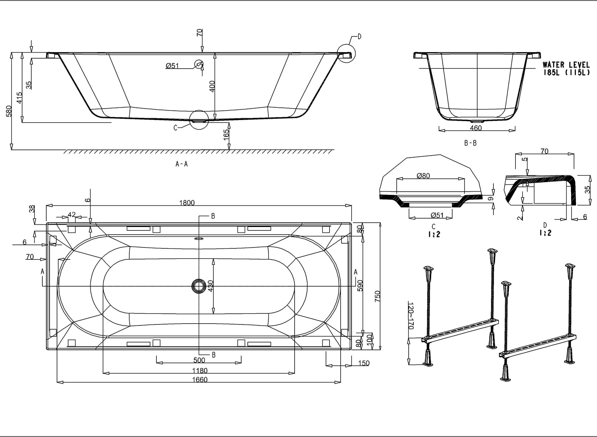 Bath Tub L - 1800mm x W - 750mm x H - 415mm R46CW