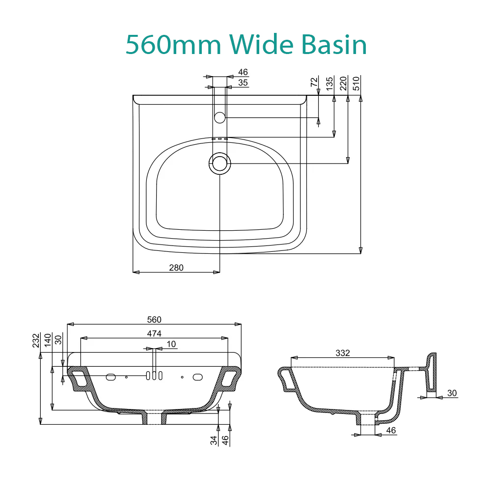 • Size of Basin: 560 x 510 x 232mm [Width x Depth x Height]