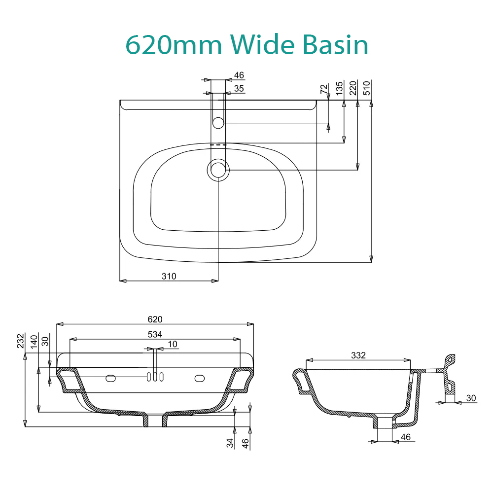 • Size of Basin: 620 x 510 x 232mm [Width x Depth x Height]